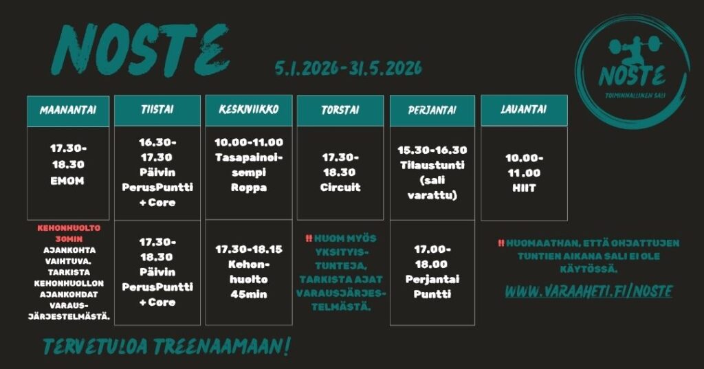 Huomioithan, että ohjattujen tuntien aikana sali ei ole avoinna omatoimitreenaajille. Salilla voi olla myös tilaustunteja sekä yksityistunteja, niiden varaukset näet varausjärjestelmästä.